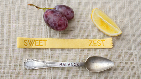 A still life composition featuring ripe purple grapes, a slice of vibrant lemon zest, and a vintage silver spoon inscribed with 'BALANCE' sits on a textured cloth, representing the perfect harmony of sweet and zest, perfect for culinary concepts.