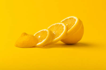 sliced lemon on a yellow background, trendy citrus fruit