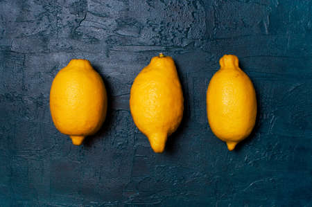 Three fresh lemons on the navy blue textured table, top view