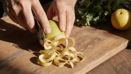 A person uses a vegetable peeler to remove the skin from a crisp green apple. The peel curls onto a rustic wooden cutting board in natural sunlight.