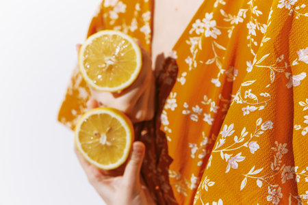 Woman holding two lemons on a white background