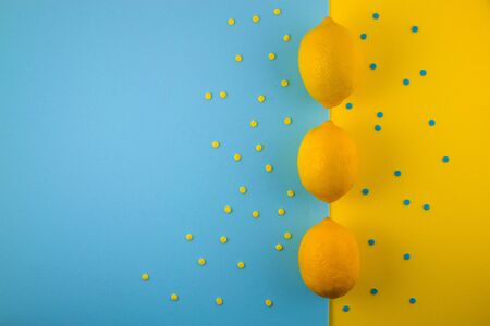 top view of three lemons on pastel multicolored background