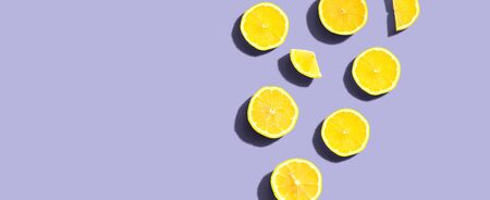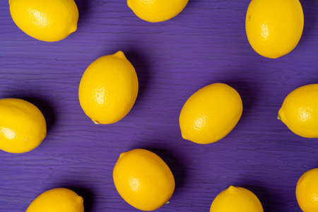 Top view of lemon on purple wooden background