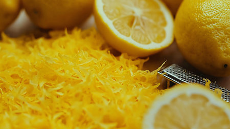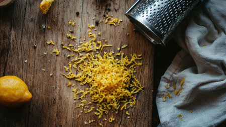 This image showcases freshly grated lemon zest scattered on a wooden cutting board, accompanied by a grater and whole lemon, creating a warm kitchen atmosphere.