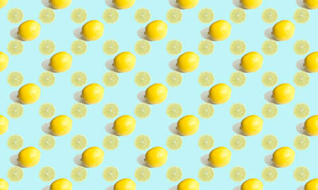 Seamless geometric pattern, sectional lemon and whole citrus on a gentle blue background. Pattern