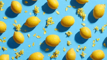 A stunning composition featuring fresh lemon slices adorned with yellow petals, set against a bright blue background, perfect for designs that evoke freshness and summer vibes.