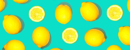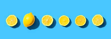Fresh lemon pattern on a vivid blue background. Flat lay, top view, copy space. Lemon framework, spring, vitamins, body detox concept