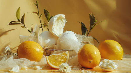 Fresh lemons and a halved lemon displayed with cream and green leaves on a yellow background, creating a vibrant and fresh composition.
