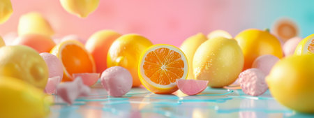 A lively display of vibrant citrus fruits with pastel accents on a colorful background. The fresh, bright scene is perfect for themes related to citrus products, tropical flavors, and cheerful presentations.