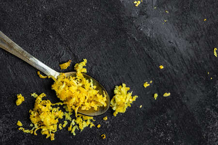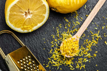 Peeling lemon rind to add zest to Mediterranean recipes. Grater peel and lemon zest on black background, place for text, top view.