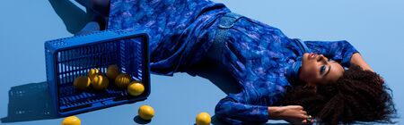 panoramic shot of african american woman lying with shopping basket and lemons on blue background