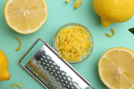 Lemon zest in bowl, fresh fruits and grater on turquoise table, flat lay