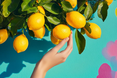 A delicate hand stretches toward plump lemons hanging from a leafy branch, set against a bright turquoise background, capturing nature's bounty.