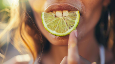 With a smile, she takes a bite of the sour lime, feeling happy as the juice drips down her chin. Her surfer hair flutters in the breeze, while the grass tickles her bare feet AIG50