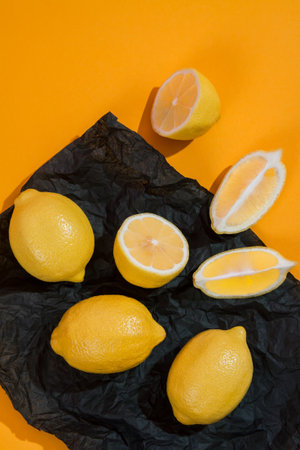 group fresh Lemons and pieces of slices on black matte crumpled clothespin tissue paper on yellow background. Citrus Vegetarian Healthy eating food fruit concept. top view, copy space