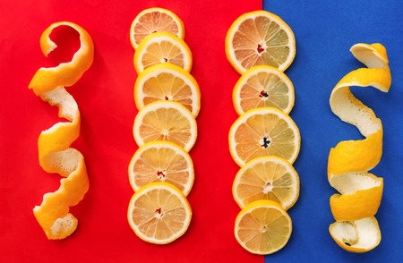 Lemon slices and peel on color background, top view