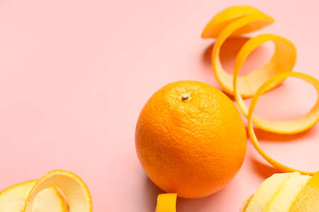 Fresh orange with peel on color background