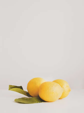 A closeup of fresh ripe yellow lemons with leaves on a white background