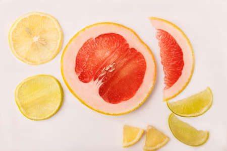 On a background are slices of grapefruit and lemon. View from above.