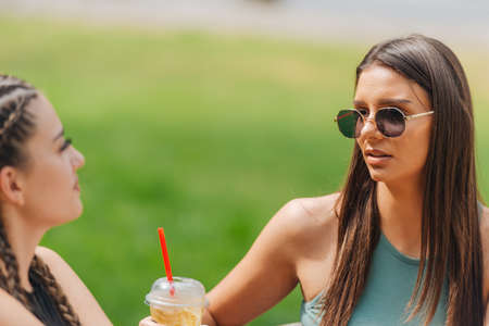 Two beautiful young women sitting on the grass and laughing while having a lemonade drink in glass jars, during a friendly hang out in city park.