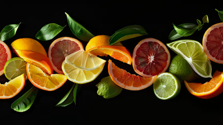 Top view of halves of lemons and limes on dark black background