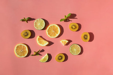 Flat lay of Sliced fruits on pink bacjground with natural sunlight hard shadows. Trendy summer template.