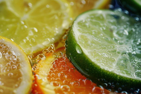 Closeup of lemon, lime, and orange slices submerged with effervescent bubbles