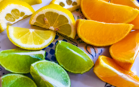 Oranges limes grapes lemon citrus fruits on the white plate for preparing breakfast or lunch in Playa del Carmen Mexico.
