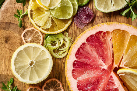 A collection of sliced citrus fruits, including oranges, lemons, and limes, arranged in a circular pattern on a wooden board.