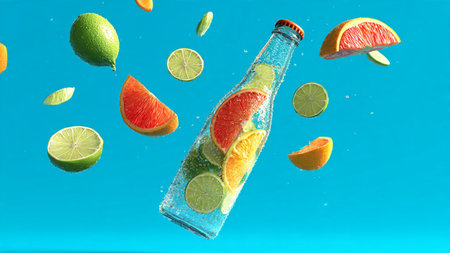 A vibrant and refreshing citrus drink featuring slices of orange, lime, and cucumber, set on a bright blue background, capturing the essence of summer and hydration.