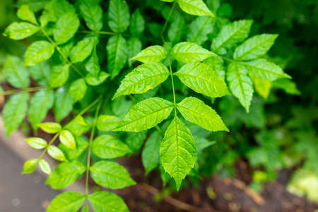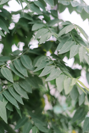 Close-up of lush green leaves of an Ailanthus altissima (tree of heaven, ailanthus, Ghetto Palm, stinking sumac, varnish tree, or Chinese chouchun tree), a Simaroubaceae plant.