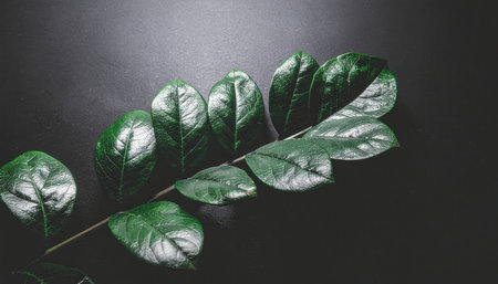 Green leaves of Zamiocгlcas zamiifolia on black background, close up. Beautiful glossy branch of a houseplant, isolated layout.