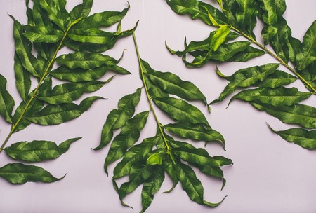 Flat-lay of tropical tree green leaves over pastel pale lavender or lilac background, top view. Spring or Summer layout concept