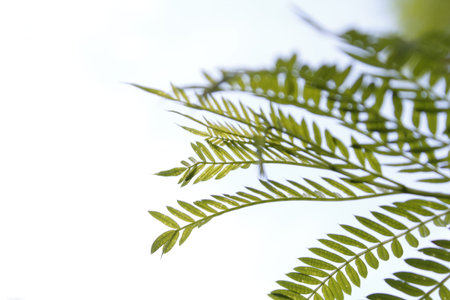 Green leaf branches on white background. flat lay, top view. Copy space. Still life. Sun Flare