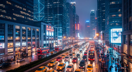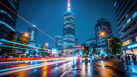 A dynamic urban landscape at night with brightly lit skyscrapers and bustling streets, showcasing a fusion of modern energy and vibrant lights