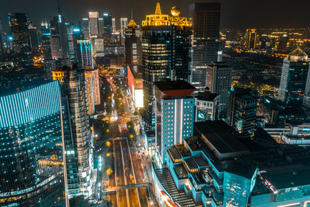 Aerial view of skyscrapers at night in Shanghai, China