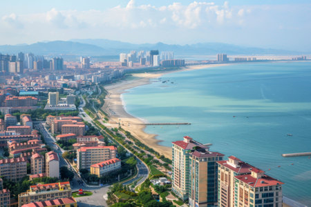 The aerial view shows a sprawling cityscape meeting the vast expanse of the ocean. High-rise buildings, roads, and bridges form the urban area, contrasting with the blue waters of the sea.