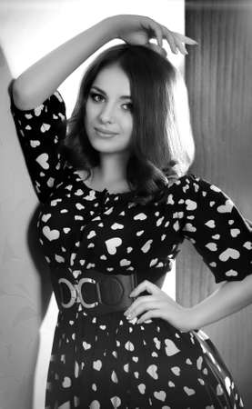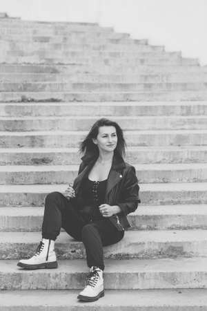 Style girl sitting on the bench in the cafe. Photo in black and white style.