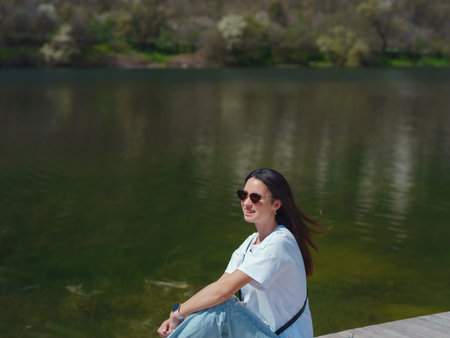Young woman enjoying beauty of nature mountain lake. Adventure travel in Europe. Lady on wooden bridge on background with forest.