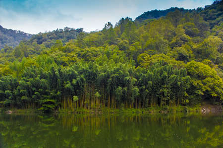 The still water of the lake and green lush bamboo forest