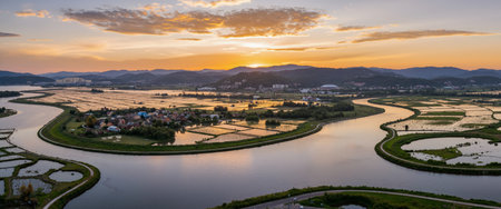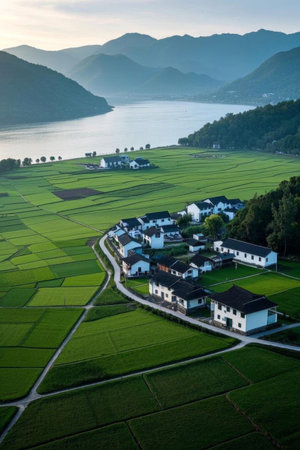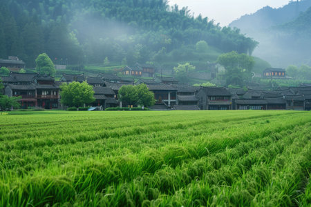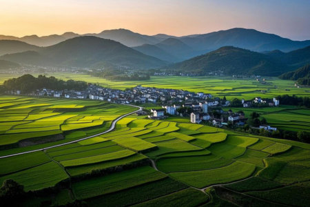 A peaceful village in the bucolic landscape, a poetic dwelling among the rice fields
