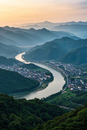 This breathtaking aerial view captures a river gracefully curving through lush green mountains, framed by a dramatic sunset sky filled with vibrant clouds.