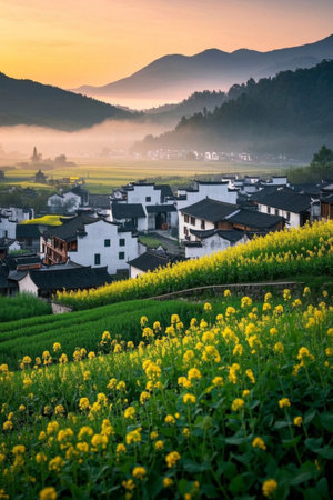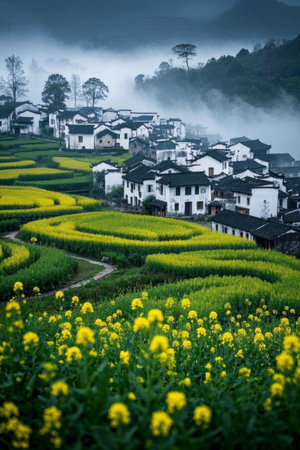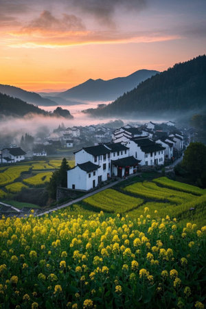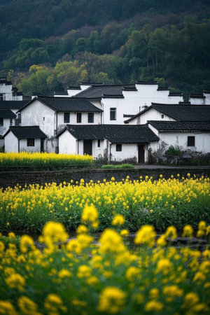 Mountain village rapeseed fields and Hui style architectural landscape