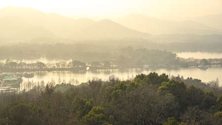 Beautiful landscape view of lake and mountain in the morning, Hangzhou, China