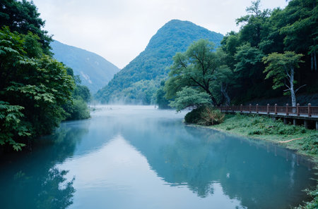 Chinese style pavilion landscape beside a river in the mountains