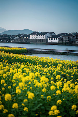 Rural riverside rapeseed flowers and residential scenery