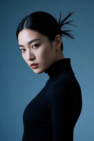 Portrait of a beautiful asian woman in black clothes on blue background