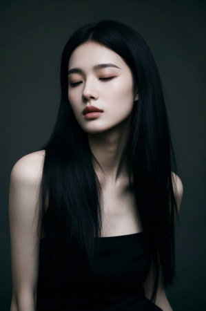 Portrait of young asian female with wavy hair and soft expression.
