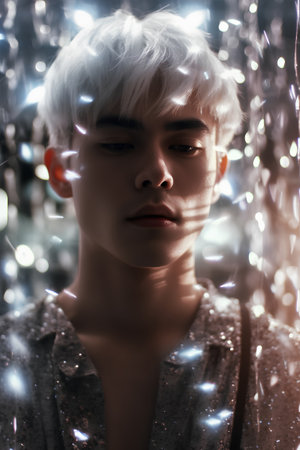 Portrait of a handsome young man with short white hair. Fashion shot.