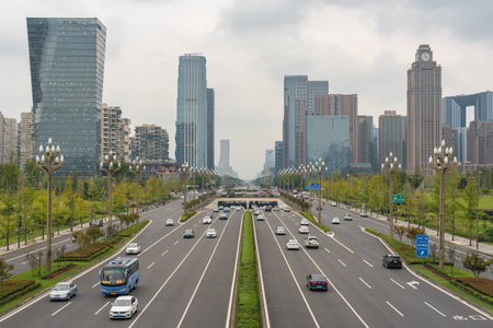 Chengdu, Sichuan, China. Road From Chengdu Tianfu International Airport To Chengdu City. High-rise Houses Elevated View Cityscape Skyline On Background. Urban Residential Areas. Real Estate, Development Industry. Chengdu Is Capital City Of Chinese Province Of Sichuan In Southwestern China. Car Drive On Highway In China
